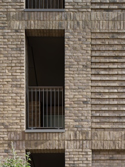 The inset pavilion typology announces the main entrances and connections to the park, bringing high levels of daylight and sunlight to all homes, with the northeastern and northwestern facing façades dual aspect. Although predominantly textured brick, articulated metal panels clad the building tops and middle sections, providing a rhythm and depth to the façade. At ground level, recessed four-bed duplexes, some of which are wheelchair accessible, face the park, giving excellent views and grounding the building in the surrounding natural space.