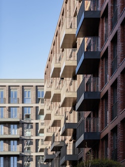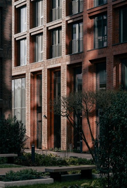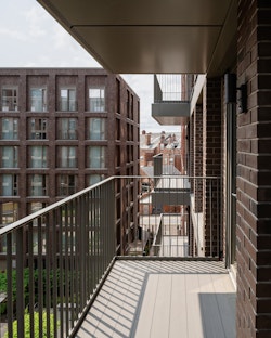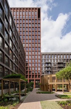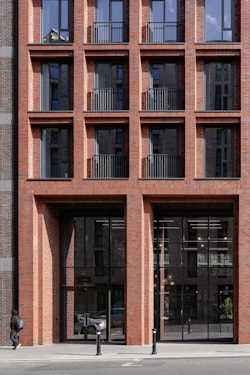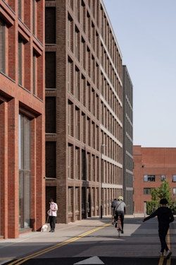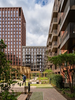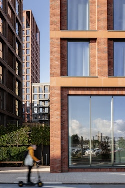 The façades use an innovative brick-slip system, blending warm tones and textures that respond to the local vernacular. Two taller marker buildings frame the key corners, strengthening the urban grain and reinforcing key vistas through the site.