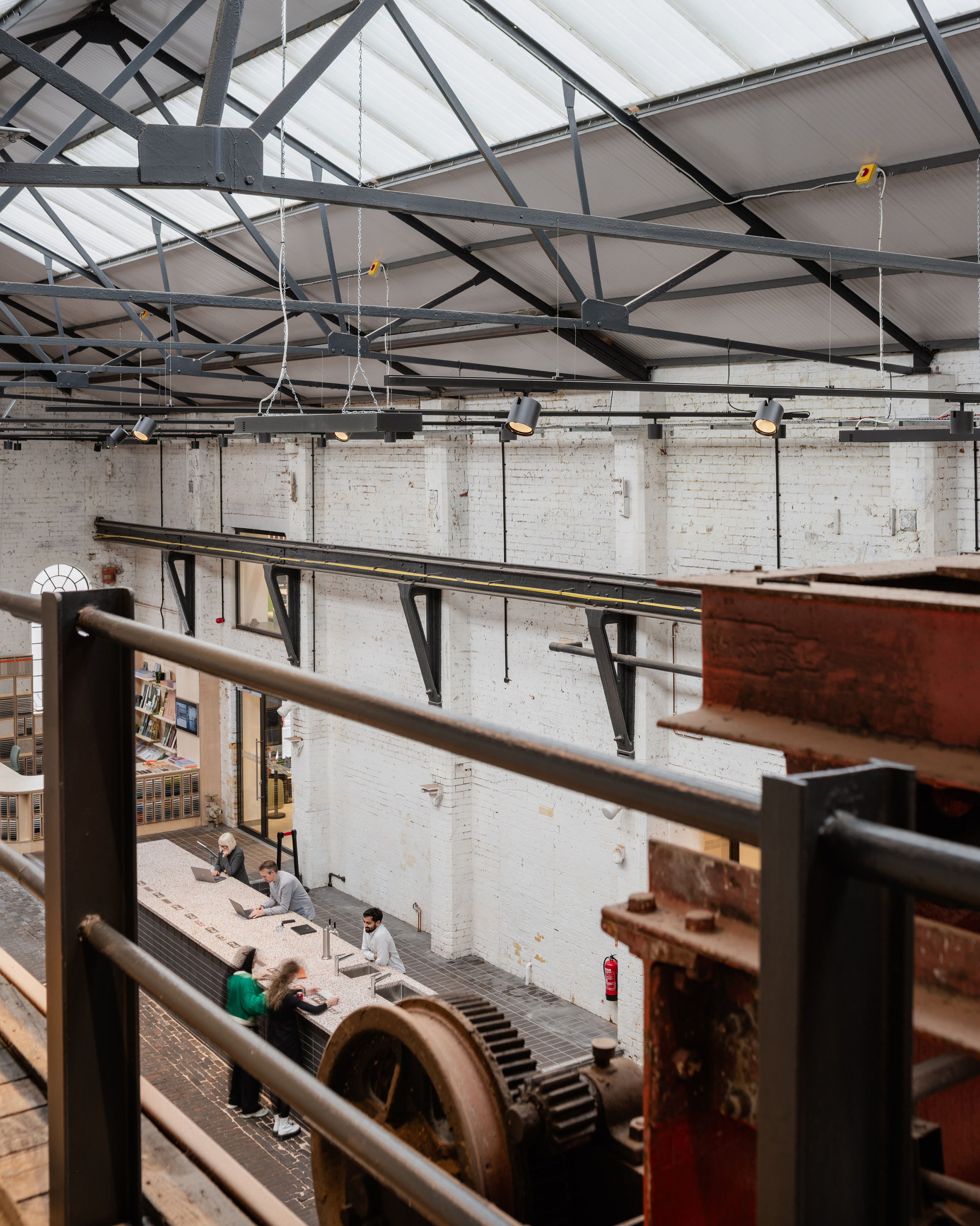 Inside, the triple-height showroom, features fixed and flexible displays dedicated to the company’s product ranges. Light, white-washed interiors are stripped back to reveal original brickwork and structure, while restored floors and exposed materials frame the displays. Existing mezzanines provide flexible workspace on either side of the main hall, connecting people with the activity below.