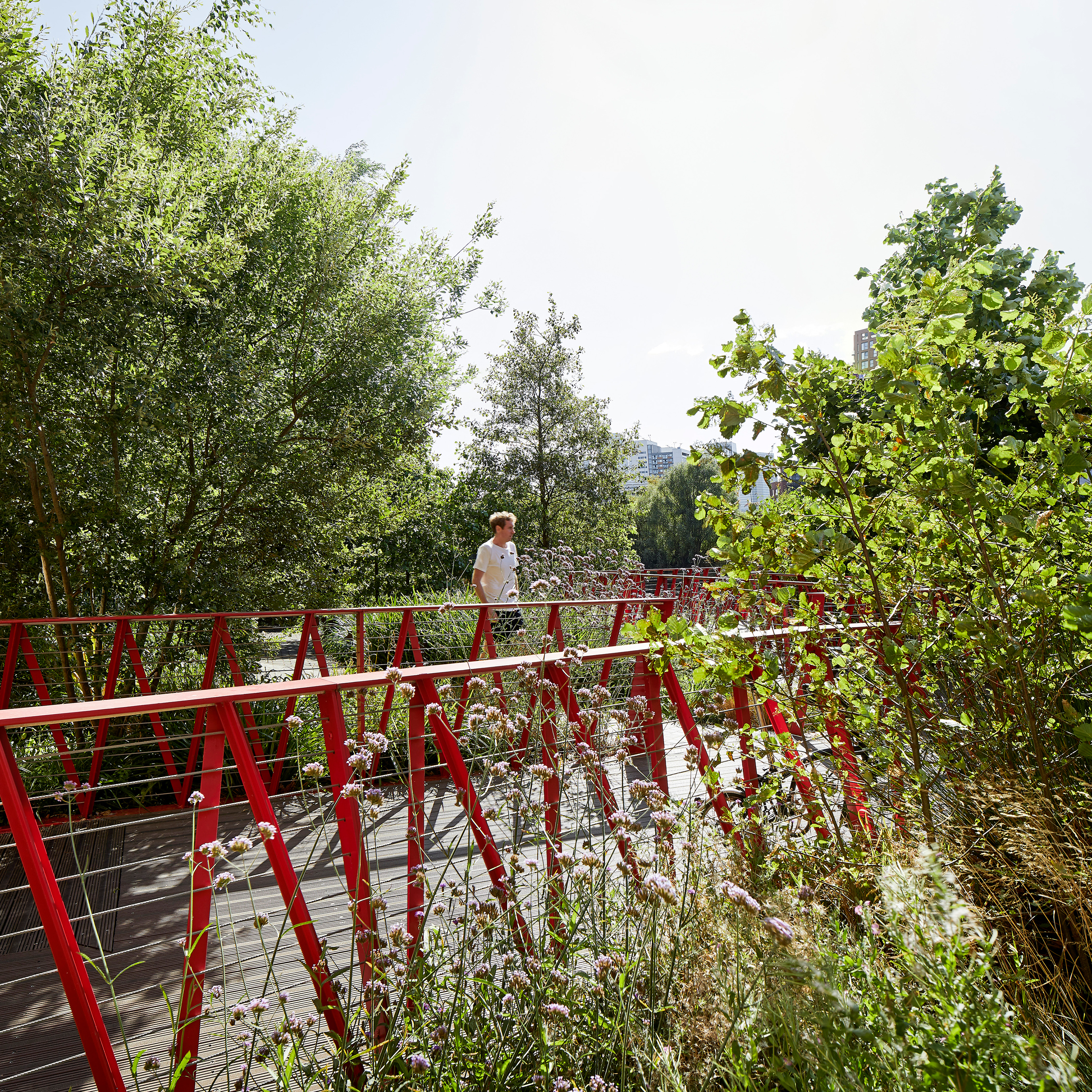 Key to the connectivity and success of the project is a pedestrian bridge linking across the River Lea to Canning Town station. The high-impact crimson red structure of the vertical lifting bridge is integral to our assemblage of forms—signalling the way to the island cityscape in a bright splash of colour.